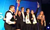 Bildet øverst: Kjøpmann Asgeir Viken Holsen jubler fra scenen sammen med selgere Mats Andersen, Charlotte Alice Larsen, Mathias Engelstad og Endre Solhaug.